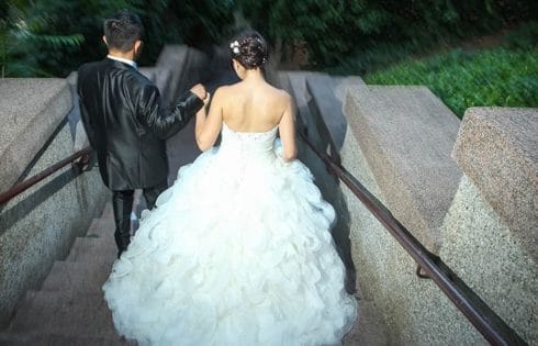 Newlyweds walking down stone stairs